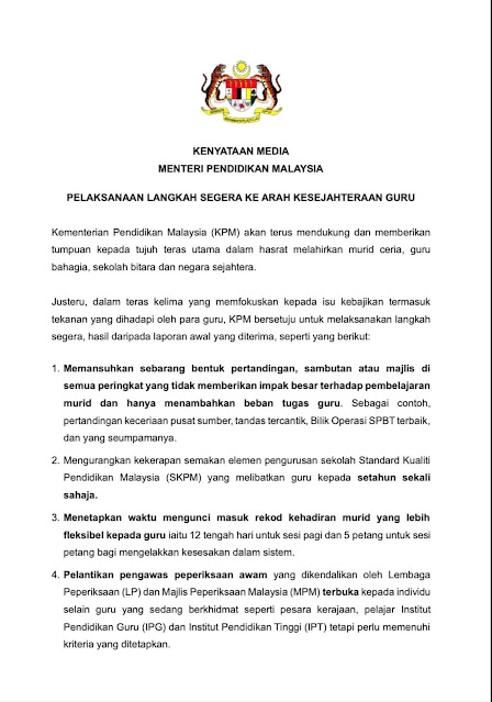 Therefore, in the fifth pillar which focuses on welfare issues including the pressures faced by teachers, KPM has agreed to implement immediate steps, based on the preliminary report received, as follows: